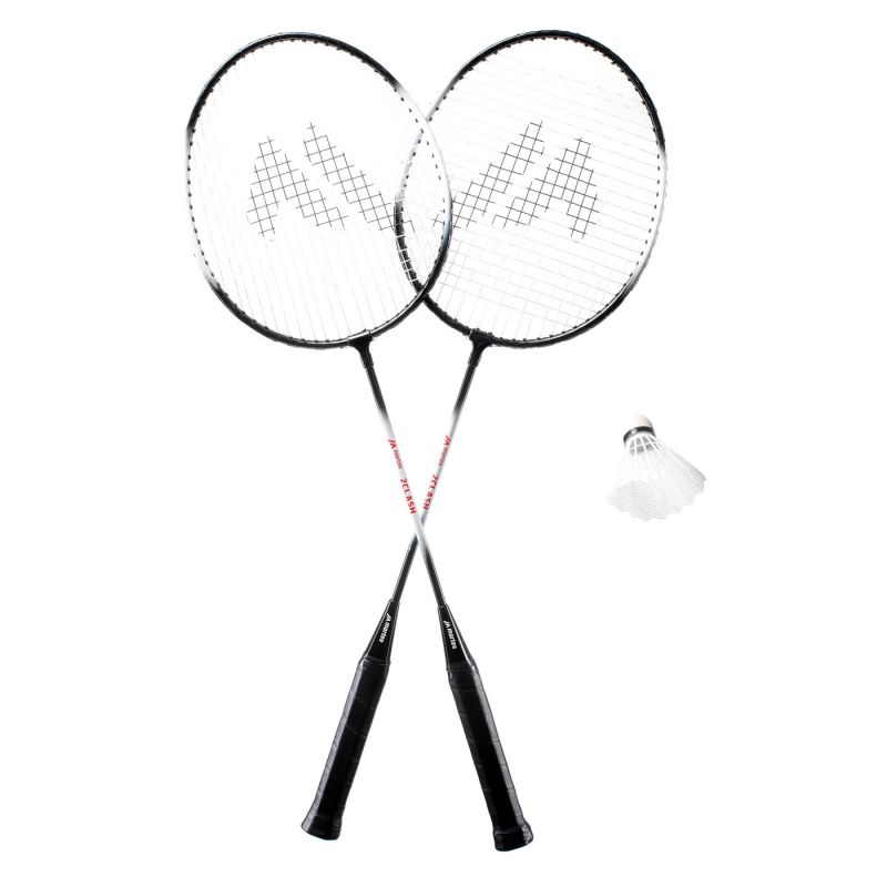 BADMINTON RACKET SET SIZE: LENGTH: 662 ±1 mm THICKNESS: 7.88 mm GRIP: G3 WEIGHT: 110+5 G MATERIAL COMPOSITION: HEAD: STEEL SHAFT: STEEL CONNECTOR: ALUMINUM STRING: NYLON GRIP: PVC SHUTTLES: NYLON