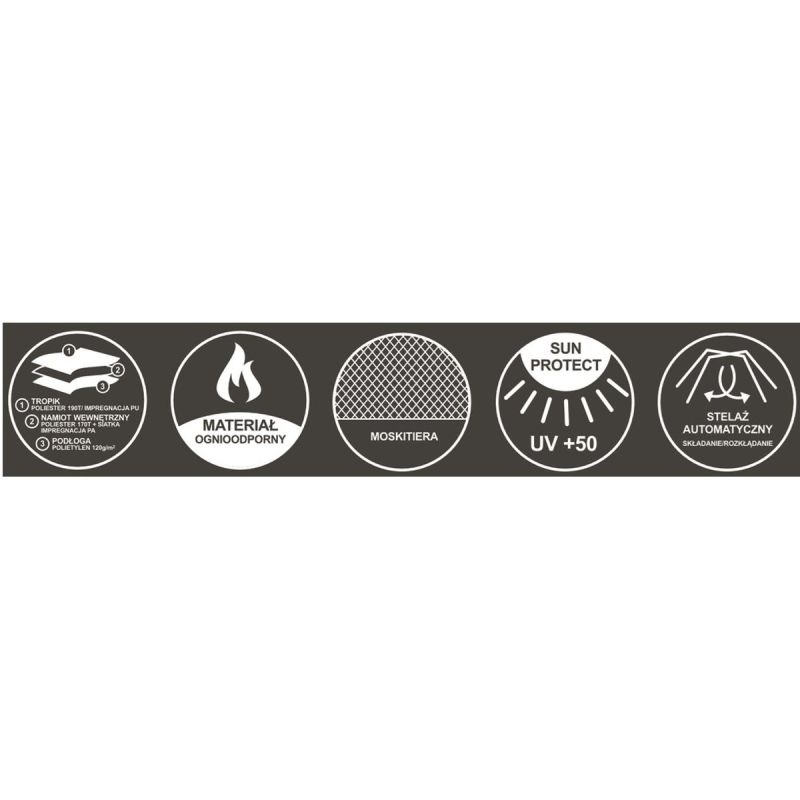 The tent floor is made of durable and tear-resistant 120g/m² polyethylene, the flysheet is made of 190T polyester with PU impregnation, and the tent shell is made of 170T polyester with PA impregnation. The tent is fire-resistant, waterproof to 2000mm, and UV-resistant to +50.
