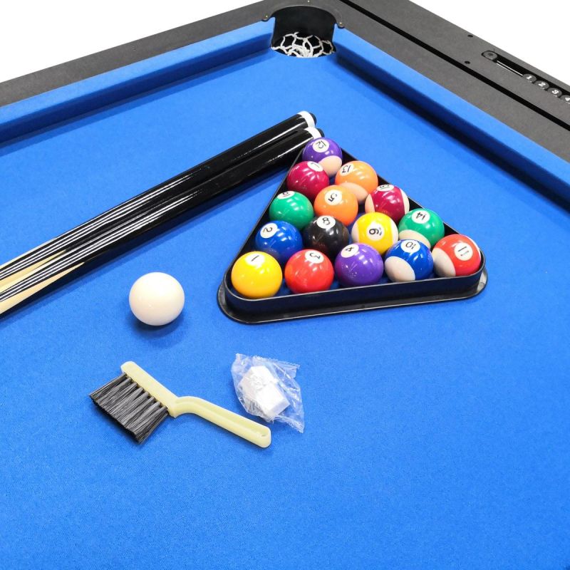 - Set includes: 2-1/4" balls, triangle, 2 57" cues, brush, 2 chalks, 2 paddles, 2 balls, net with 2 clips, 2 air hockey discs