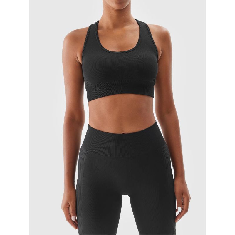 This women's workout bra features quick-drying fibers with 4FDry technology, which wicks moisture away from the body. The seamless construction prevents chafing or irritation and adapts to the body's movements during activity. It features a round neckline and soft, removable cups. A wide, non-adjustable underbust band provides support and a snug fit. The racerback design allows for unrestricted shoulder movement. Additionally, the double-layer construction provides enhanced coverage.