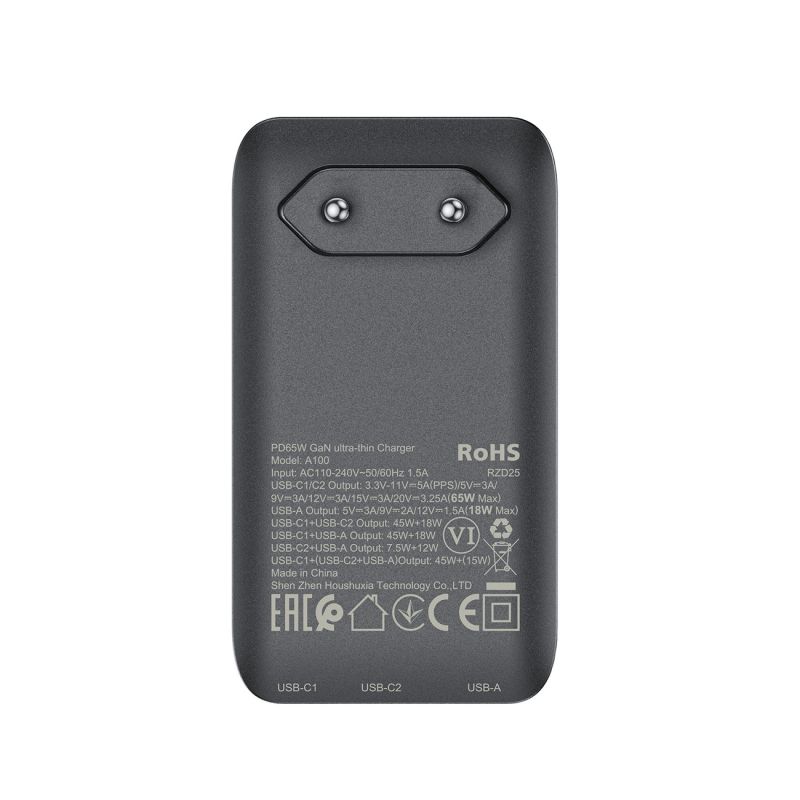 - USB-C1/C2: 3.3V-11V - 5A (PPS), 5V/9V/12V/15V - 3A, 20V - 3.25A (65W max)