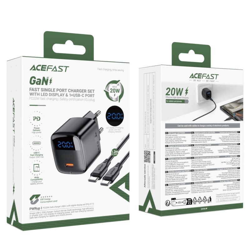 The Acefast A113 wall charger is a compact and modern 20W device equipped with a USB-C port supporting fast charging. GaN technology ensures high efficiency, reduced heat generation, and longer lifespan, while a digital LED display shows the current charging power and fast charging mode status. Thanks to its broad compatibility and support for multiple protocols, the charger works with most smartphones, tablets, and accessories. A 1.2m USB-C to USB-C cable is included, allowing you to fully utilize your device's power.