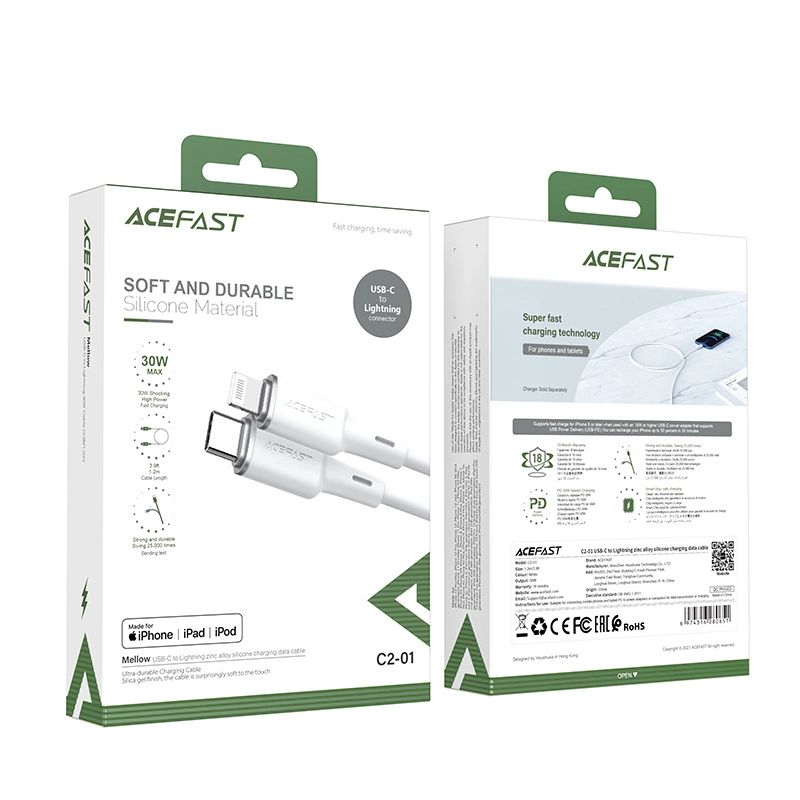 Acefast USB Type C - Lightning cable for charging and data transfer. It is designed for Apple devices with a Lightning connector. It is 120 cm long and is designed to work with a current of 30W and 3A. It is compatible with Power Delivery fast charging. It has an MFI (Maide For iPhone) certificate, so the phone will not display a message about a non-genuine accessory.