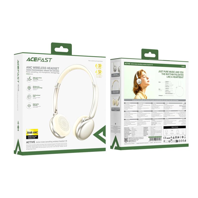 The Acefast H8 headphones, in an elegant gold color, combine modern design with excellent sound quality and effective noise reduction. Active Noise Cancellation (ANC) lets you enjoy your music with complete focus, while 40mm drivers deliver deep, clear, HiFi-quality sound. A convenient control knob, steel headband, and soft memory foam earpads ensure complete comfort, even after long hours of use. These headphones are built with quality, comfort, and style in mind.
