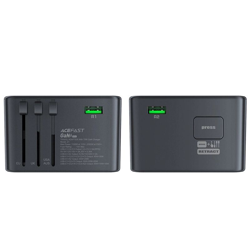 Are you looking for a universal solution to charge all your devices while traveling abroad? Meet Acefast Z1 - an adapter that combines cutting-edge technology, versatility and the highest safety standards. Thanks to the use of gallium nitride (GaN) technology, it is smaller, more efficient and cooler than traditional chargers. No matter where you are, its global compatibility allows you to charge anywhere in the world.