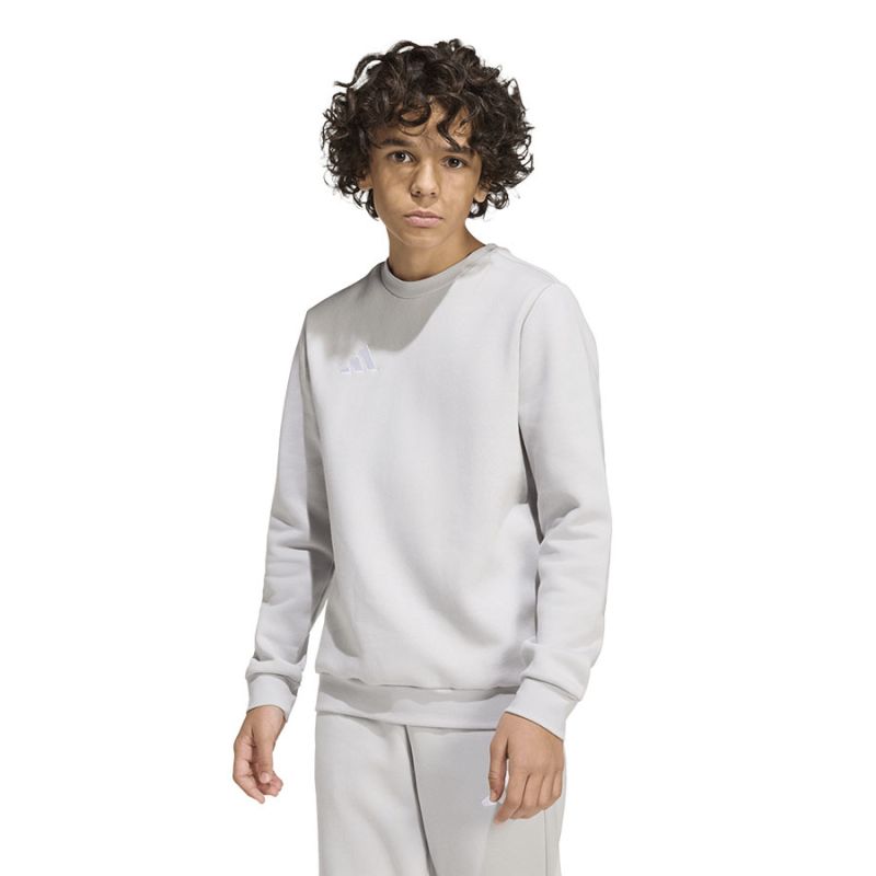 adidas Entrada 26 Sweat Top for Kids, Gray JZ6551. This adidas sweatshirt is perfect for both on and off the pitch. It's inspired by the Entrada football line. It features a regular fit. Cotton is the dominant fabric for ventilation. The polyester fibers are recycled. The fleece lining is lined. The hem and cuffs are finished with elastic cuffs. Embroidered logo. Material: 70% cotton, 30% recycled polyester.