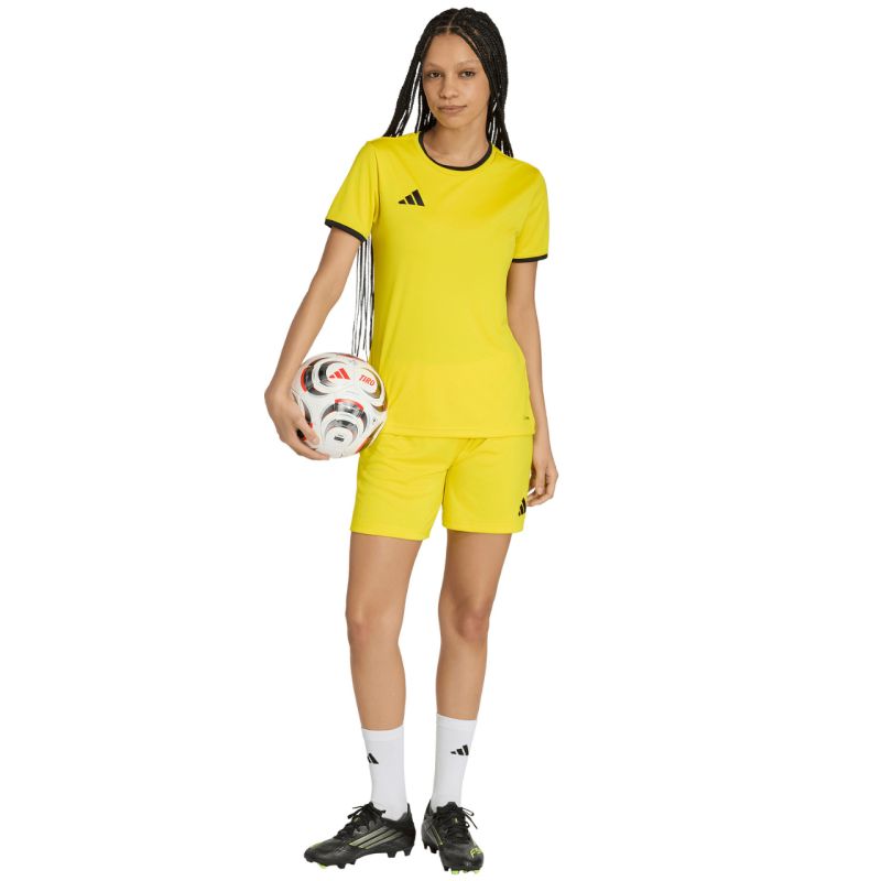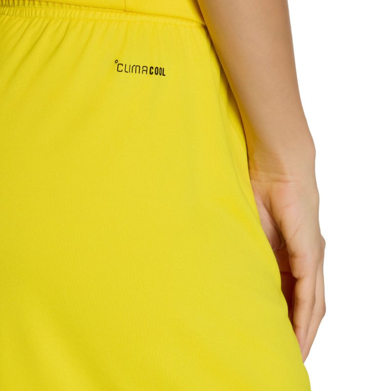 adidas Entrada 26 Women's Shorts, Yellow JZ2540. These women's shorts are perfect for training and matches. Climacool technology. Quick-drying fabric. Embroidered logo. Elastic waist. Internal drawstring. Entrada branding. Material: 100% recycled polyester