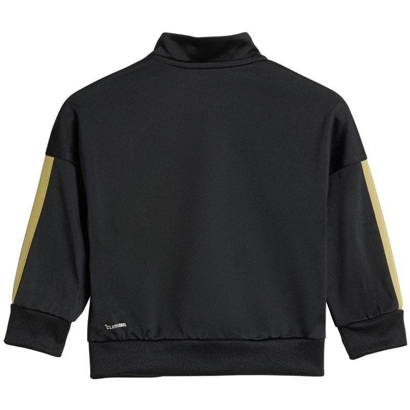 adidas Essentials Climacool Tracksuit for Kids, Black and Gold JC8857. This tracksuit is perfect for everyday activities. The fabric is quick-drying. Climacool technology helps wick sweat away from the skin. It has a standard fit. The sweatshirt has a full-length zipper and a stand-up collar. The cuffs and hem are ribbed. The pants have an elastic waist with a drawstring and stretch cuffs. Material: 100% recycled polyester