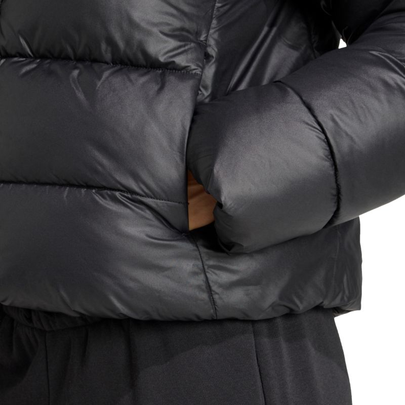 adidas Essentials Climawarm Synthetic Down Women's Jacket, Black JX7825. This adidas women's jacket is perfect for the winter. Synthetic insulation provides warmth. Climawarm technology retains heat and wicks away sweat. Durable polyester construction. Regular fit. Full-length zipper. Side pockets. Elastic hem and cuffs. Specifications: Material: 100% recycled polyester. Filling: synthetic, 100% polyester.