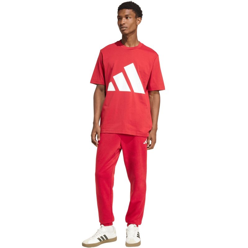 adidas Essentials Feelcozy Men's Pants, Red KC0915. These adidas men's pants are perfect for everyday wear. They feature a standard tapered fit. The legs are finished with delicate cuffs. They feature an elastic waistband with an external drawstring for adjustability. Open side pockets. Soft material. Mid-rise waist. Inner insulation. Material: 70% cotton, 30% recycled polyester.