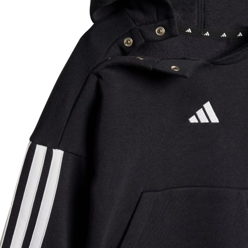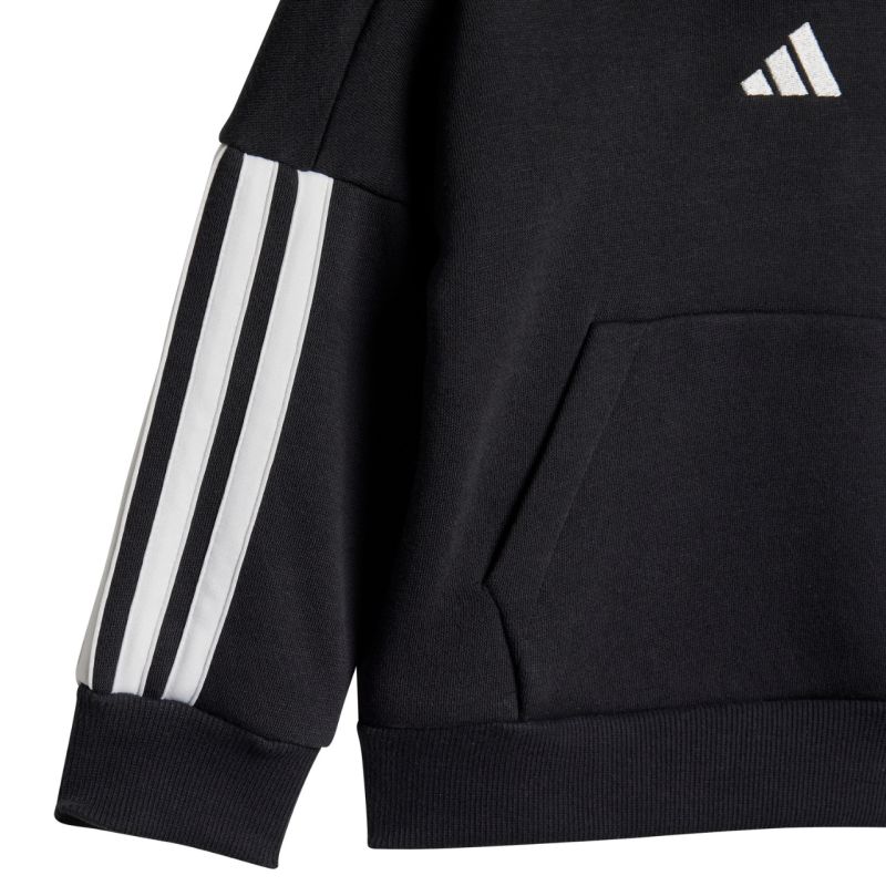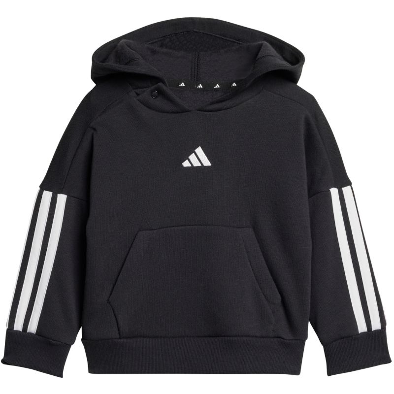 The adidas Essentials Joggers 3 Stripes Fleece Hoodie JD6484 is a tracksuit for kids from adidas. This pullover sweatshirt features snap closures up to size 86. Ribbed cuffs and hem. Elastic waistband with a drawstring for adjustment. Elastic cuffs on the pants. This tracksuit has a classic cut. It's made of a soft, high-cotton fabric with synthetic fibers. Inner insulation. Material: 70% cotton, 30% recycled polyester.