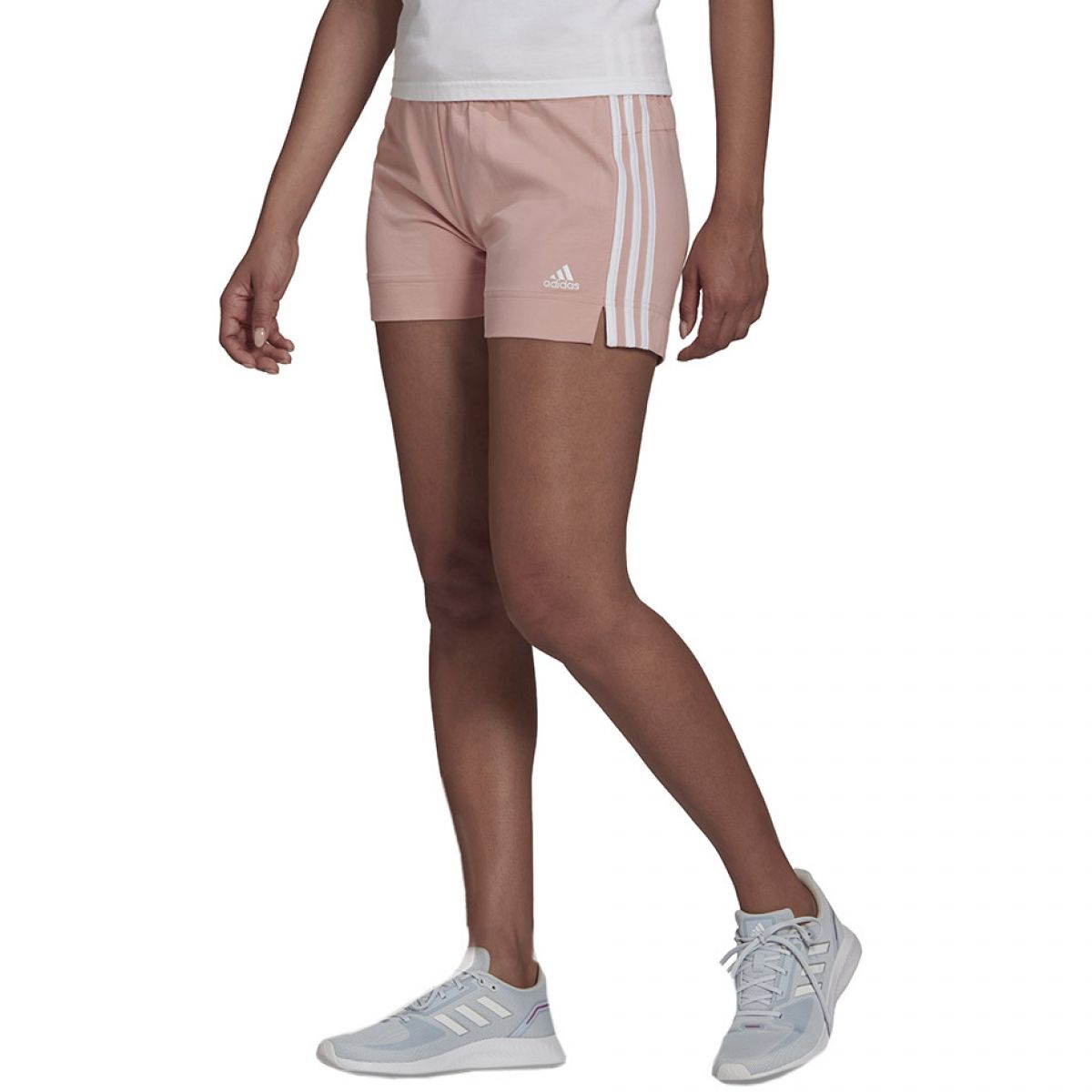 These women's adidas shorts are perfect for everyday wear. They feature a standard fit. The cotton-stretch construction offers a soft feel. The waistband features an external drawstring for adjustability. Side slits at the hem. Available in pink.