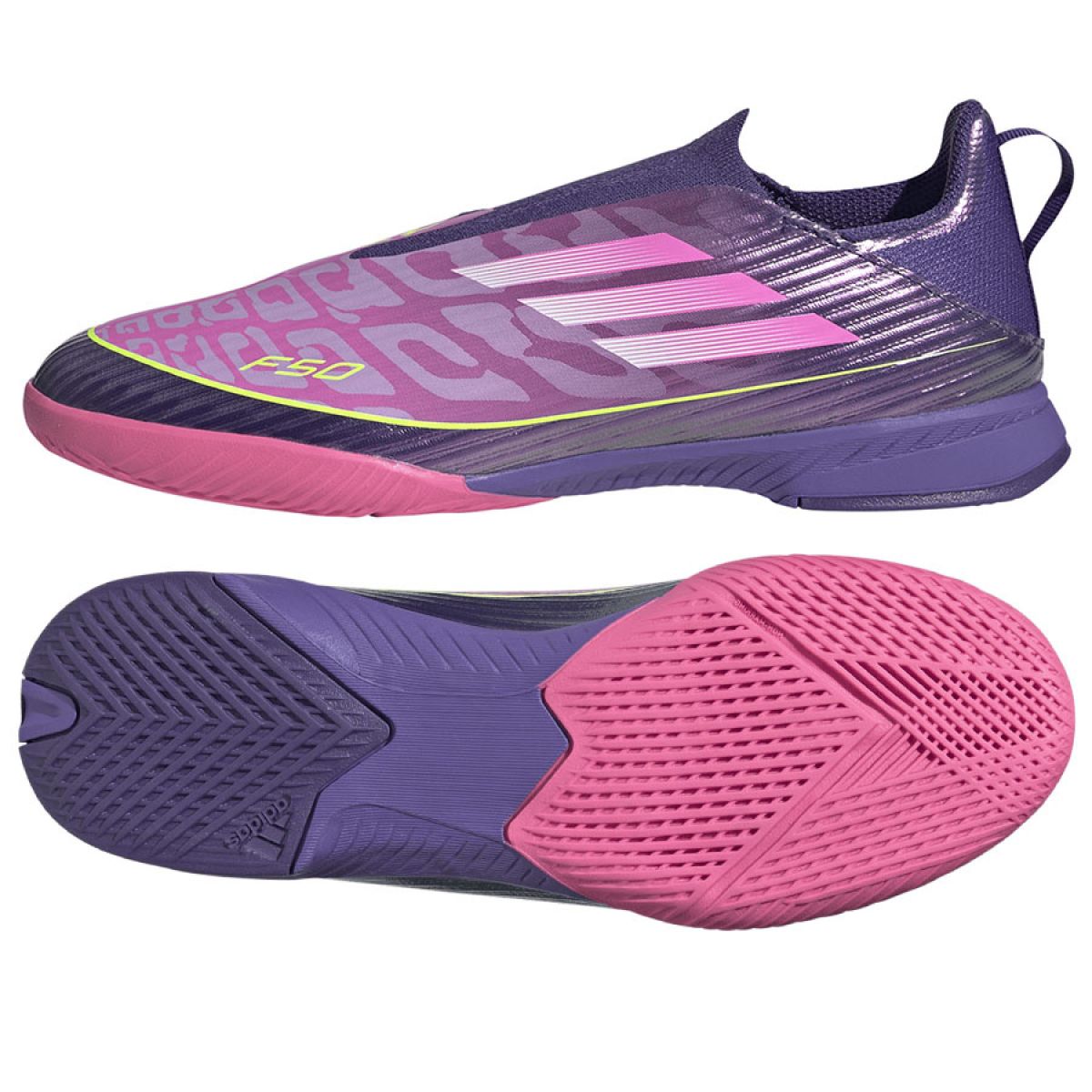 The F50 League Laceless Indoor football boots are designed to help young footballers unleash their speed. These boots are all about performance and style. The Fiberskin upper, made with a special, soft-touch construction, provides support with strategically placed 3D lines. A 2D Sprintgrid print provides a mudguard, visually mimicking the details found on high-end models. These boots feature a synthetic, floating tongue. It's lightweight and features perforations for added airflow. The abrasion-resistant, non-marking rubber outsole provides reliable traction on indoor surfaces. Featuring adidas branding and the iconic F50 logo, these boots will ensure your child makes an impression on the pitch.