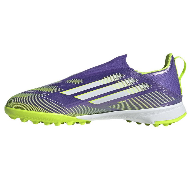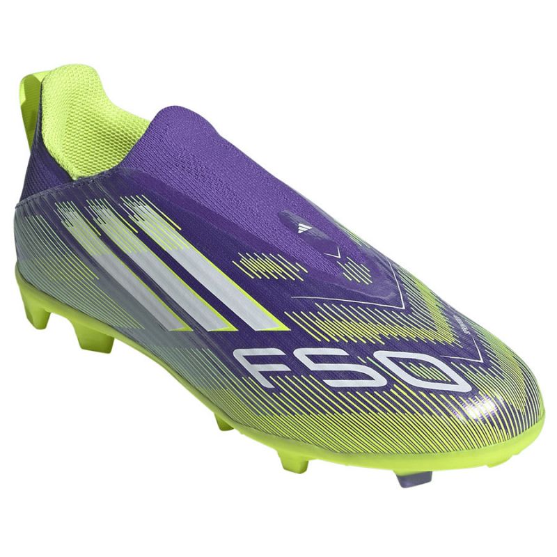 Embrace speed and unleash your full potential on the pitch. Feel the power in the adidas F50 football boots, built for speed. Featuring a Fiberskin upper, these juniors' League football boots feature a dynamic Sprintgrid print and an adaptive laceless collar for a secure fit and precise strikes. The rubber outsole with lugs ensures speed on artificial turf.