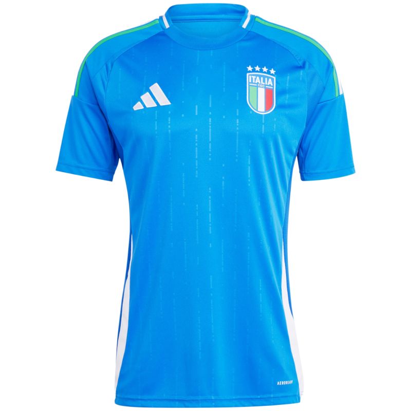 adidas Italy 24 Home Men's Jersey, Blue IN0657. The official adidas men's jersey in the home version is a real treat for fans of the Italian national team. White adidas logo. Stripes on the shoulders. Specifications: · Material: 100% recycled polyester · Slim fit · Ribbed crew neck · Aeroready · Mesh panels under the arms, on the sides and lower back