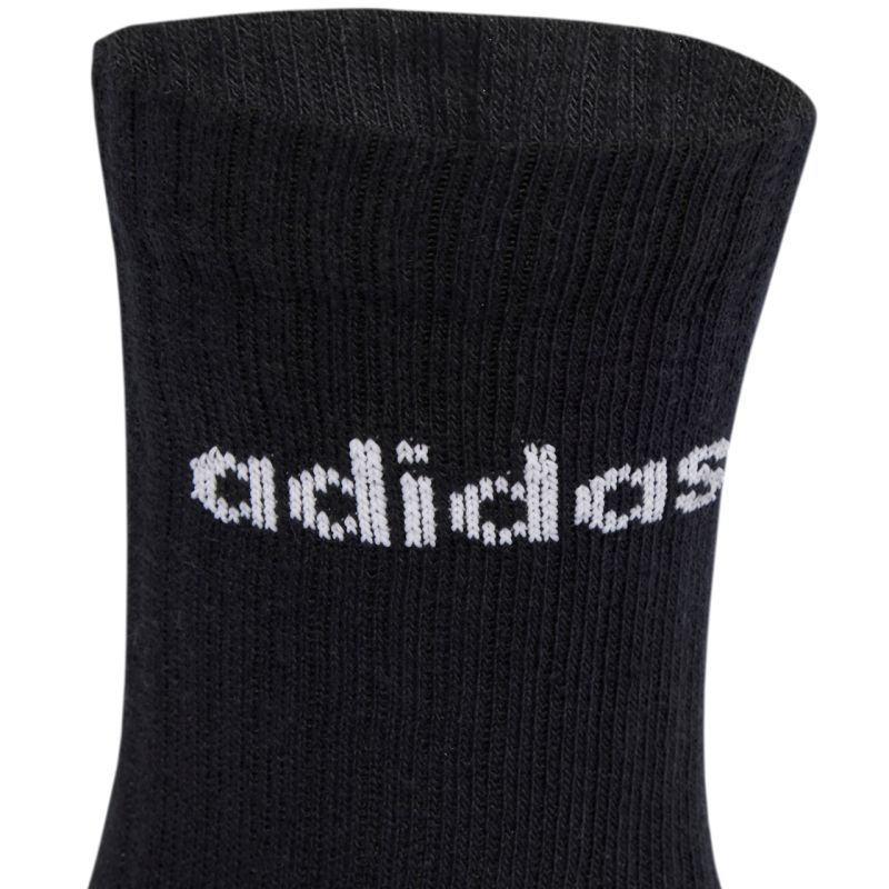 Adidas Linear Crew Socks Cushioned 6 Pair Pack, Black JL6094. These adidas sports socks feature a soft knit fabric and a fitted calf design. The elastic, high cuff provides a comfortable fit and helps keep the socks in place. These adidas socks feature a subtle brand logo. Each set includes 6 pairs of socks. Material: 100% nylon.