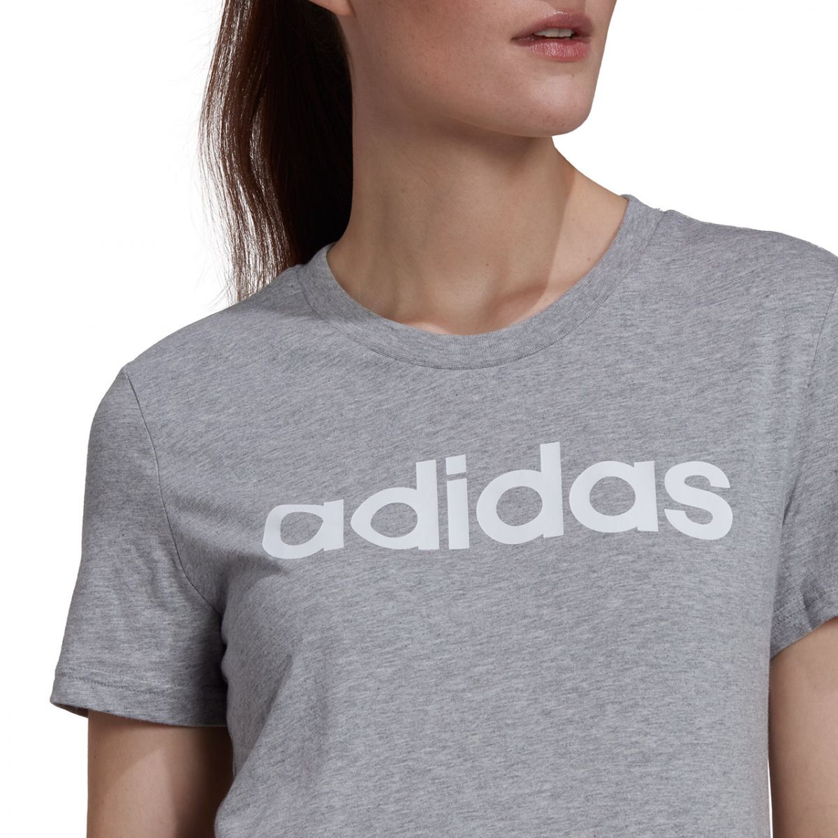- Women's gray adidas T-shirt with a large, printed logo on the chest and a rounded neckline.