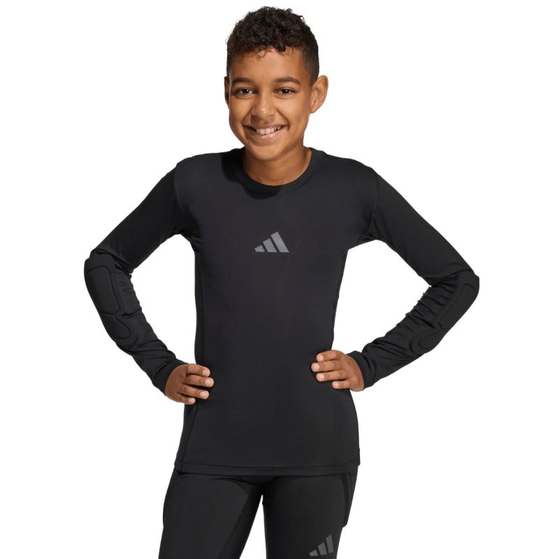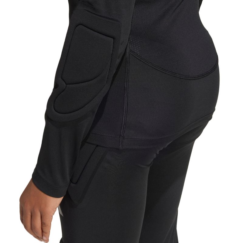 adidas Padded Goalkeeper Longsleeve Jersey for Kids (KA1678) - Black. This adidas long-sleeved jersey is designed to elevate your goalkeeping game. It features strategically placed elbow pads. It features a compression fit. It's made of double-knit fabric and features a subtle logo. Material: 83% recycled polyester, 17% elastane.