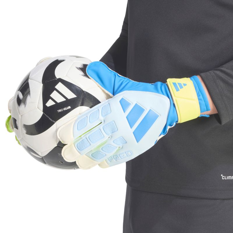 adidas Predator Training Goalkeeper Gloves White, Yellow, and Blue KA7786. adidas training goalkeeper gloves for players who value a combination of modern technology and comfort. Part of the Predator line. The cut with external seams ensures a comfortable fit and offers a larger contact surface with the ball. Soft, latex palm for greater comfort and better control. Ventilated cuff. Specifications: Material: 100% polyurethane. External seams. Ventilated cuff.