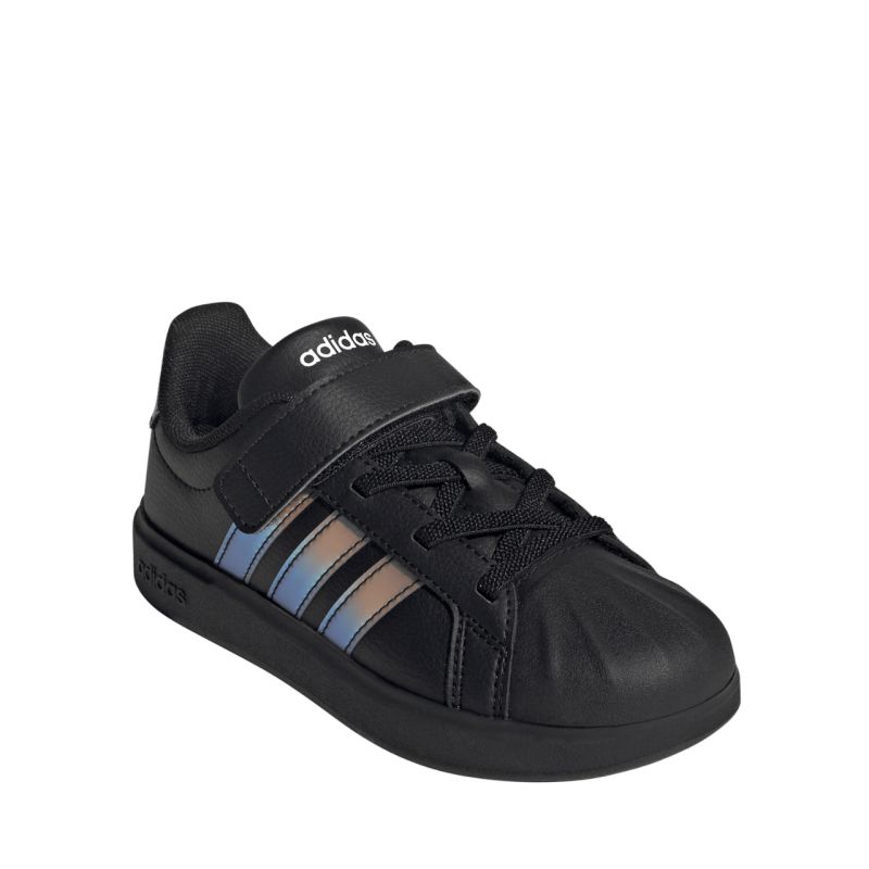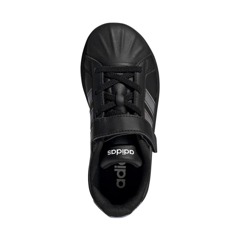 adidas Streettalk EL C JQ1808 Kids' Shoes. These adidas kids' shoes are designed for everyday wear. They feature a synthetic upper. A shell-shaped toe cap. A textile lining enhances comfort. They feature a hook-and-loop closure and elastic straps reminiscent of classic laces. Rubber outsole.