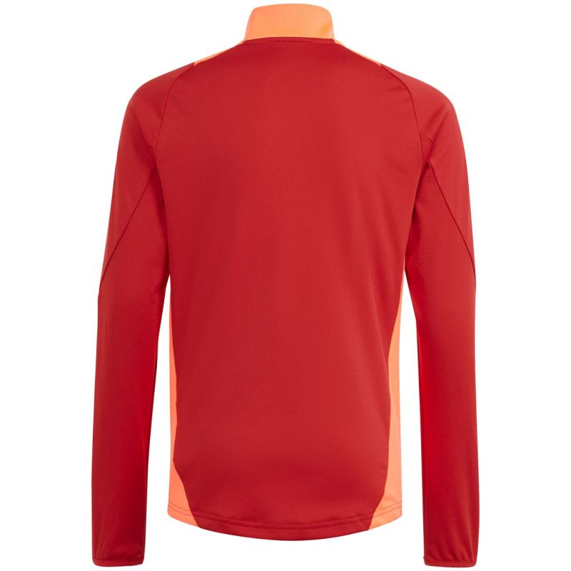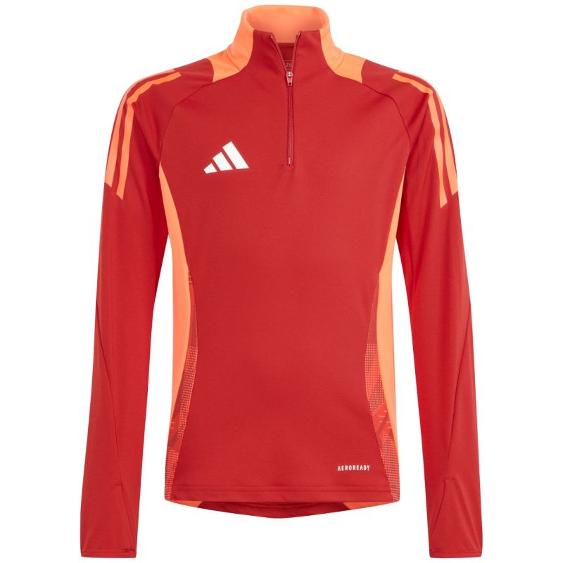 adidas Tiro 24 Competition Training Top for Kids, Red and Orange IS1652. This adidas football top for kids is perfect for training. Ribbed stand-up collar. Half-zip closure. Slim fit. Aeroready technology helps keep you dry and comfortable. Mesh panels on the shoulders and sides. Stripes on the upper sleeves. Material: 100% recycled polyester, densely knit.