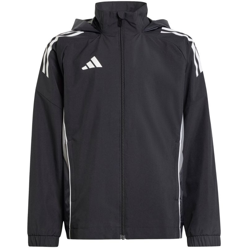adidas Tiro 25 Competition All Weather Jacket for Kids, Black IW0448 This adidas Tiro jacket for kids is perfect for training. A full-length zipper allows for quick dressing. A chin guard protects the chin. The hood is adjustable with toggles and can be tucked into the collar. Specifications: Outer fabric: 100% recycled polyester Inner fabric: 100% thermoplastic polyurethane Standard fit Front zip pockets Mesh lining Concealed hood Elastic cuffs