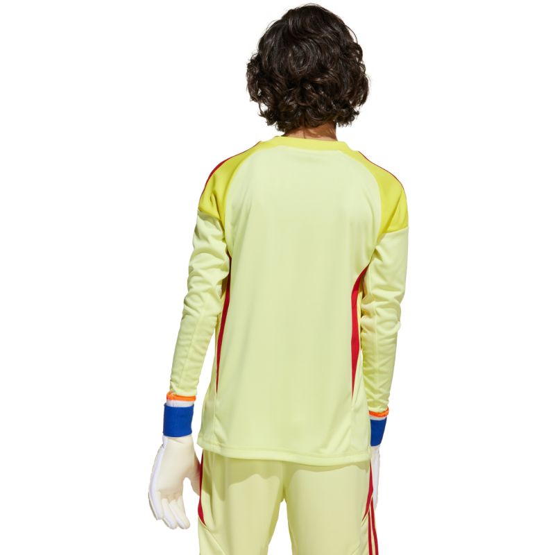 adidas Tiro 25 Competition Long Sleeve Kids' Goalkeeper Jersey, Yellow and Red, KJN2020. This adidas goalkeeper jersey will keep your child focused on the game. The embossed graphics are inspired by professional football team jerseys. It features a regular fit with a ribbed crew neckline. Aeroready technology helps wick away moisture. Long sleeves. Material: 100% recycled polyester