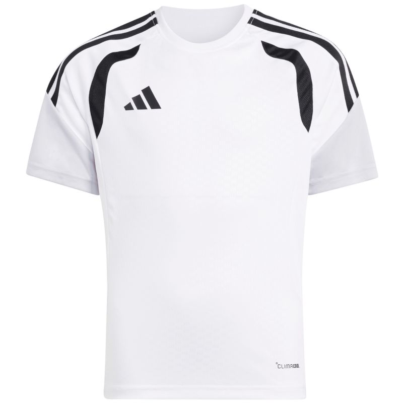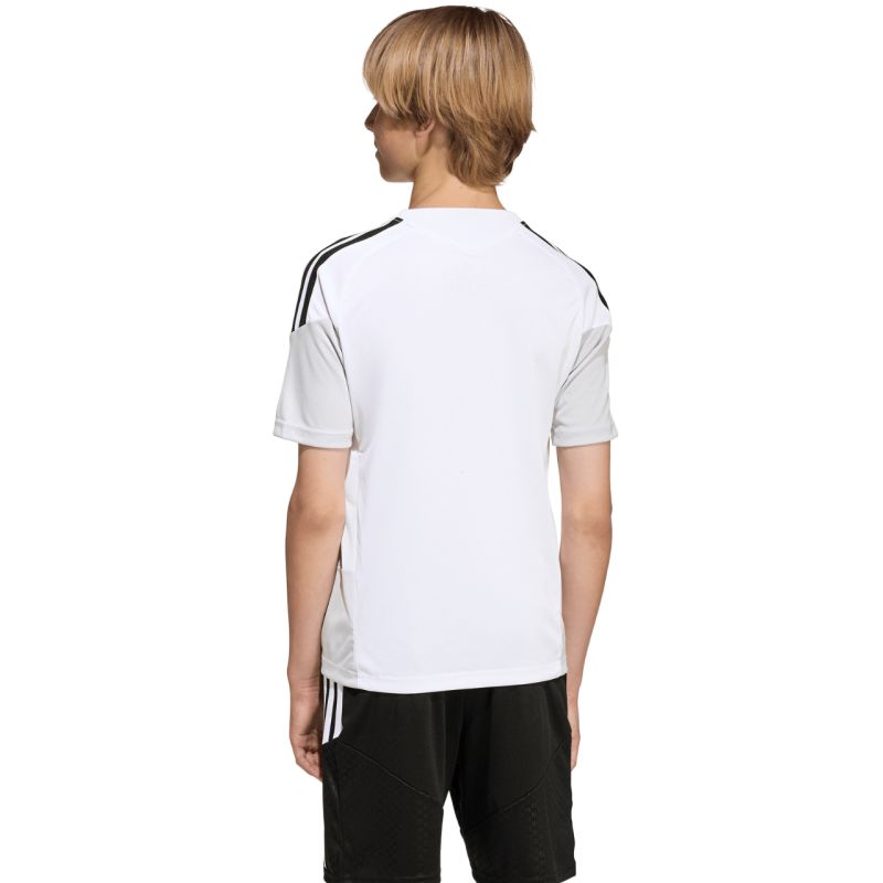 The adidas Tiro 26 Competition Training Jersey for kids, white and black, KA7603. This adidas jersey is perfect for training and decisive matches. It features a regular fit. Mesh panels on the chest. Climacool technology absorbs and wicks away sweat. Recycled fibers. Subtle logo. Stripes on the sleeves. Material: 100% recycled polyester.