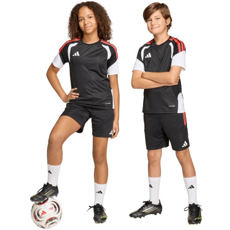 adidas Tiro 26 Competition Training Shorts for Kids, Black KA7657. These adidas shorts are perfect for training. This model is from the Tiro line. The elastic waistband is adjustable with an internal drawstring. Climacool technology absorbs and wicks away sweat. Stripes on the sides. Subtle logo. Material: 100% recycled polyester