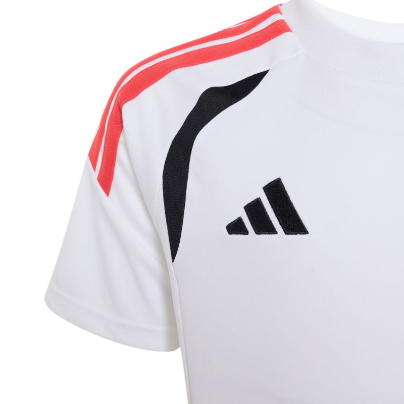 adidas Tiro 26 League Jersey for Kids, White, Black, and Red KR0369. This adidas jersey for kids is perfect for football matches. Regular fit. Crew neck. Mesh panels. Climacool technology. Recycled fibers. Material: 100% recycled polyester