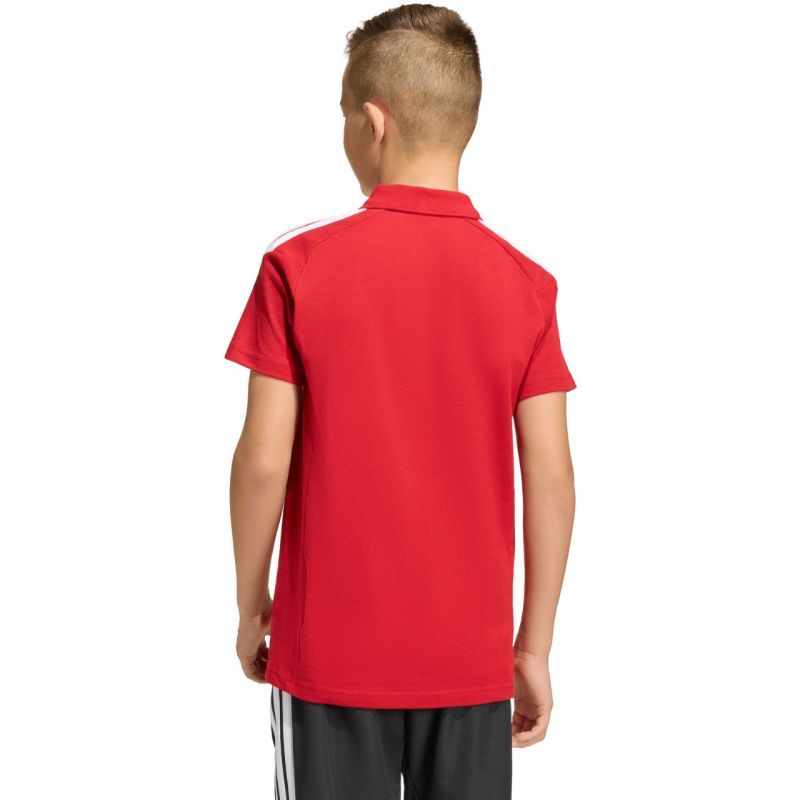 adidas Tiro 26 League Polo Shirt, Red KF3408. This adidas kids' shirt is perfect for cheering on the sidelines and traveling with the team to matches. It's from the Tiro collection. It features a collar and button placket. It's cut in a regular fit. It features an embroidered logo. It's made of pique fabric. Material: 70% cotton, 30% recycled polyester.