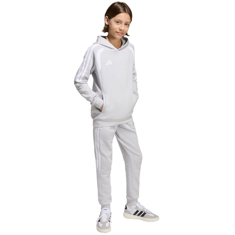 adidas Tiro 26 League Sweat Pants for Kids, Gray JY9672. Part of the Tiro line, these adidas kids' pants are perfect for relaxing between training sessions. They combine breathable cotton with durable polyester fibers. They feature a regular fit with ribbed lower leg panels. They feature an elastic waistband with an internal drawstring for adjustability. Zippered side pockets. Material: 70% cotton, 30% polyester.