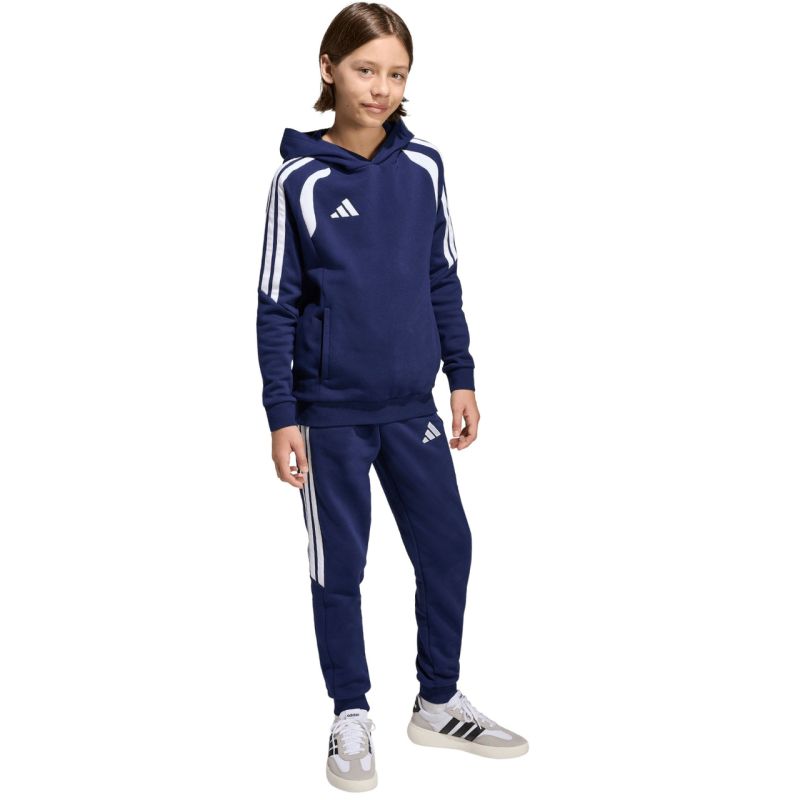 adidas Tiro 26 League Sweat Pants for Kids, Navy Blue JY9673. These adidas Tiro pants for kids are perfect for relaxing between training sessions. A blend of breathable cotton and durable polyester fibers. They feature a regular fit with ribbed lower leg panels. They feature an elastic waistband with an internal drawstring for adjustability. Zippered side pockets. Material: 70% cotton, 30% polyester.