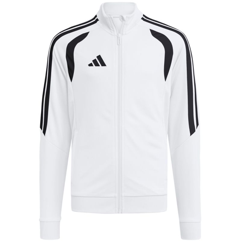 adidas Tiro 26 League Training Sweatshirt for Kids, White KT2339. This adidas football sweatshirt for kids is perfect for training. Stand-up collar. Full-length zipper. Slim fit. Climacool technology wicks and disperses sweat. Stripes on the sleeves. Subtle logo. Quick-drying fibers. Material: 100% recycled polyester