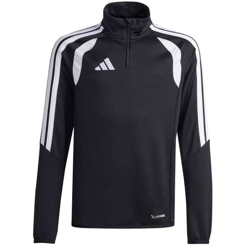 adidas Tiro 26 League Training Top for Kids, Black and White JY7161. This adidas football sweatshirt for kids is perfect for training. Finished with a chin guard and a half-zip closure. Slim fit. Climacool technology is a functional solution that keeps you cool, dry, and focused on the game. The hem and cuffs are finished with elastic trim. Contrast mesh inserts. Stripes on the sleeves. Subtle logo on the chest. Material: 100% recycled polyester
