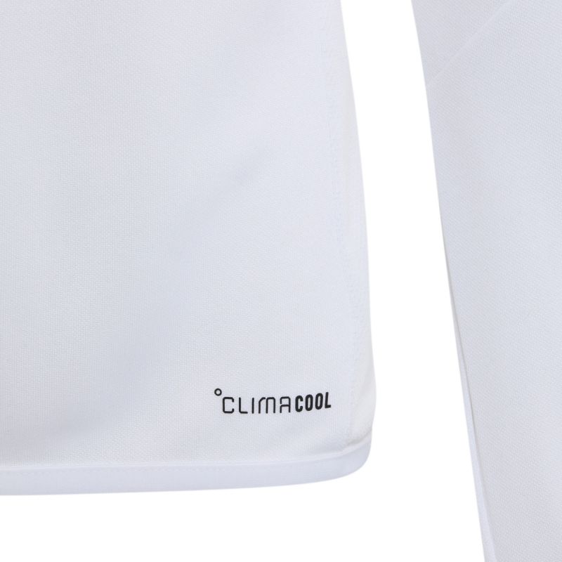 adidas Tiro 26 League Training Top for Kids, White, Black, and Red KR0370. This adidas football sweatshirt for kids is perfect for training. Finished with a chin guard and a half-zip closure. Slim fit. Climacool technology is a functional solution that keeps you cool, dry, and focused on the game. The hem and cuffs are finished with elastic trim. Contrasting mesh inserts. Stripes on the sleeves. Subtle logo on the chest. Material: 100% recycled polyester