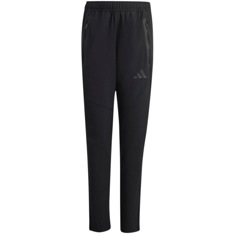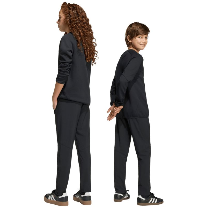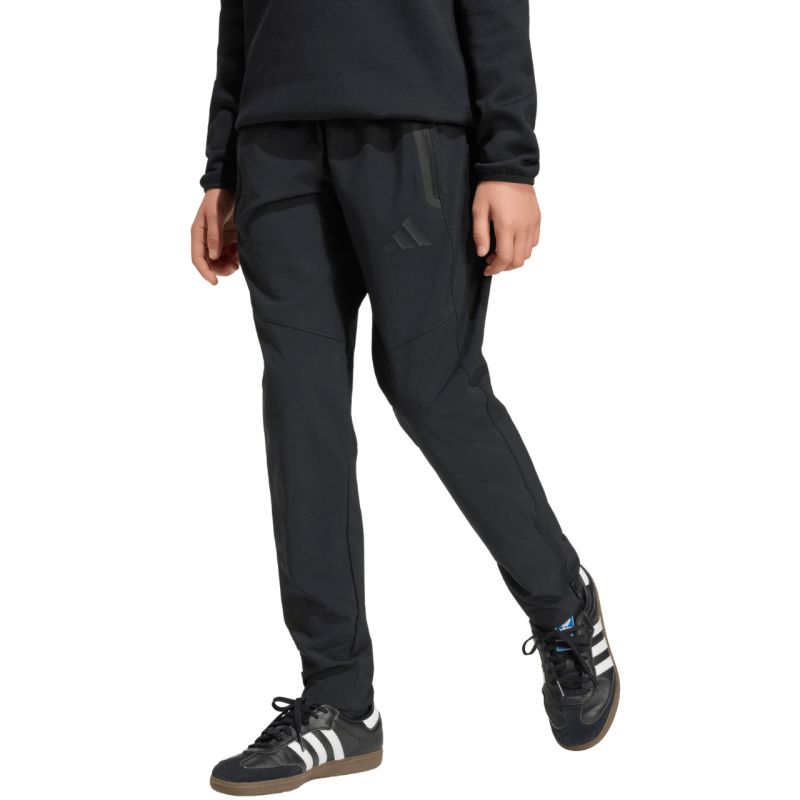 adidas Tiro 26 Travel Woven Kids' Pants, Black JM5556. These adidas men's pants, part of the Tiro line, are perfect for relaxing between training sessions. Quick-drying plain weave fabric. Regular fit. Tapered legs with ergonomic seams and zippers. Elastic waist. Zippered side pockets. Small logo. Material: 87% recycled polyester, 13% elastane.