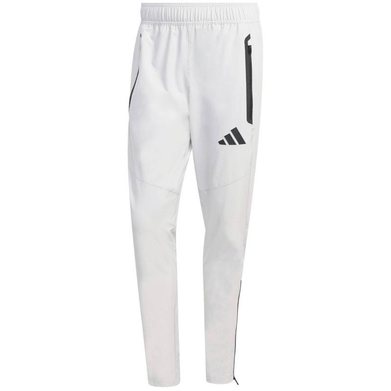 adidas Tiro 26 Travel Woven Men's Pants Light Gray KE8363. Part of the adidas Tiro line, these men's pants are perfect for relaxing between training sessions. Quick-drying plain weave fabric. Regular fit. Tapered legs with ergonomic seams and zippers. Elastic waist. Zippered side pockets. Small logo. Material: 87% recycled polyester, 13% elastane