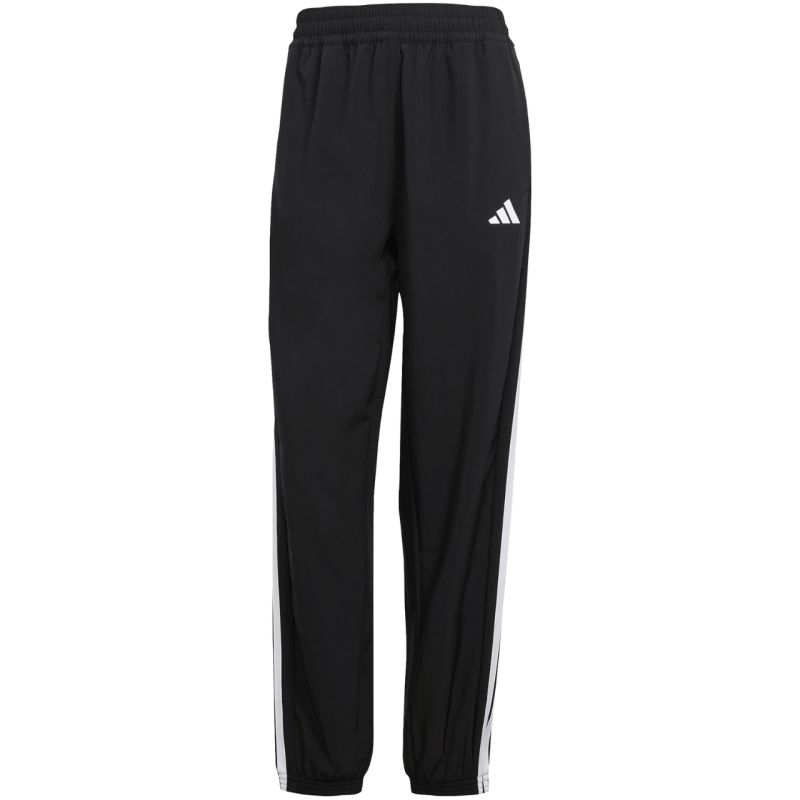 adidas Train Essentials 3-Stripes Woven Women's Pants, Black JI8313. These adidas women's pants are perfect for active wear. The adjustable mid-rise cut features an elastic waistband. Wider, slightly tapered legs are finished with elastic cuffs. Open side pockets. Climacool technology helps wick sweat away from the skin. Material: 87% recycled polyester, 13% elastane