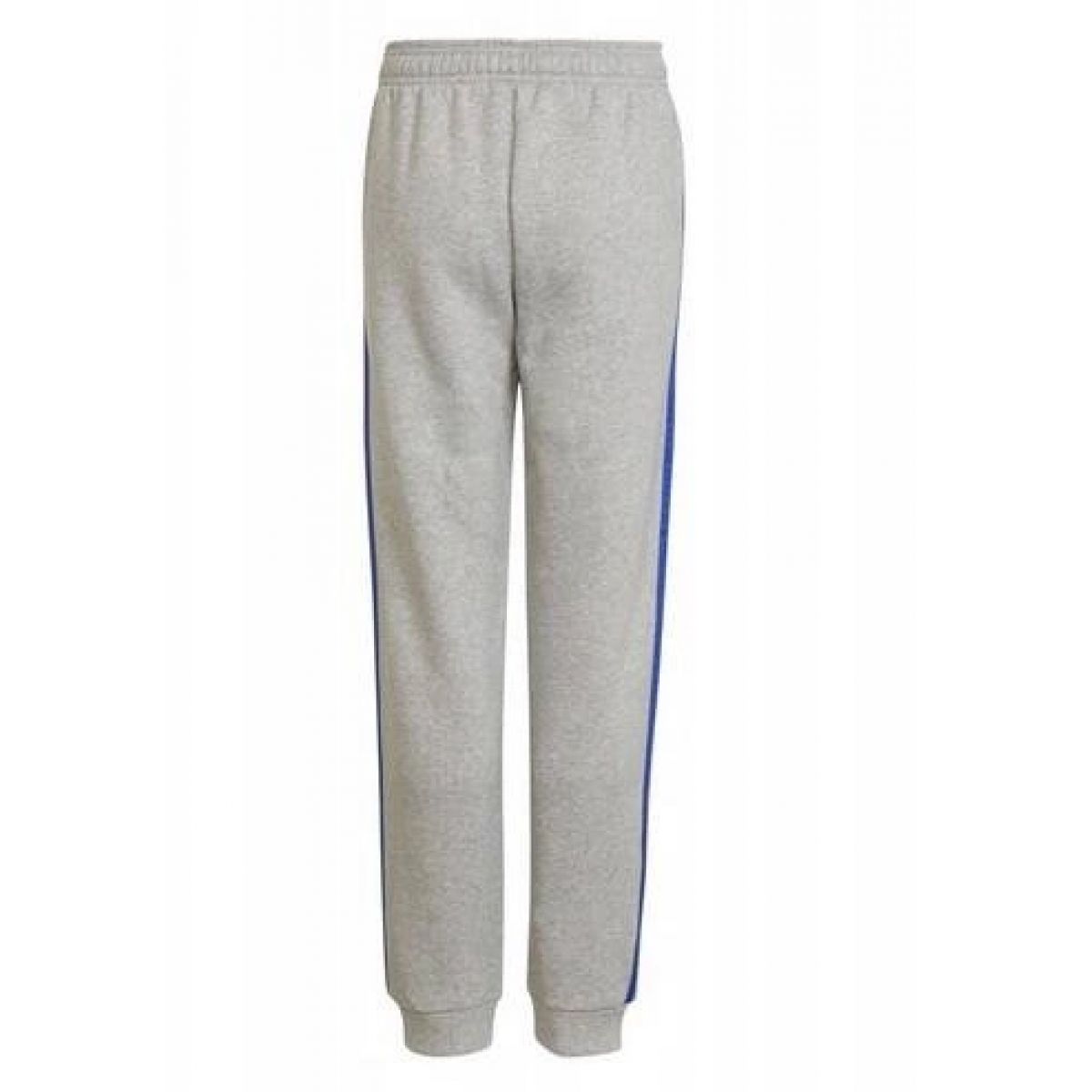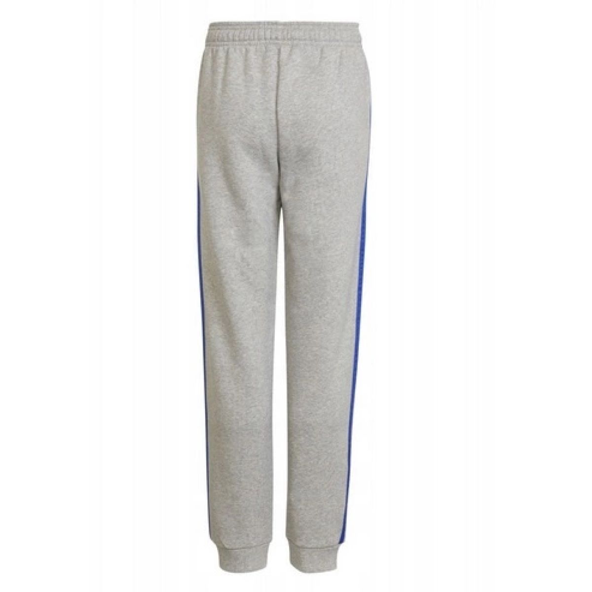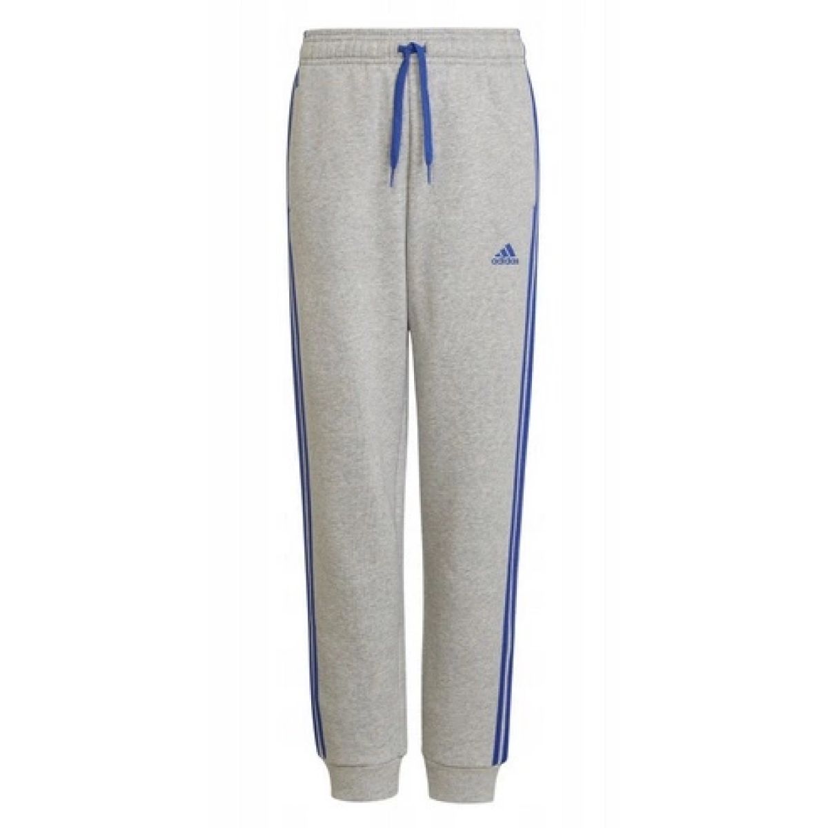 - Fashionable Adidas sweatpants in gray with blue stripes and logo.