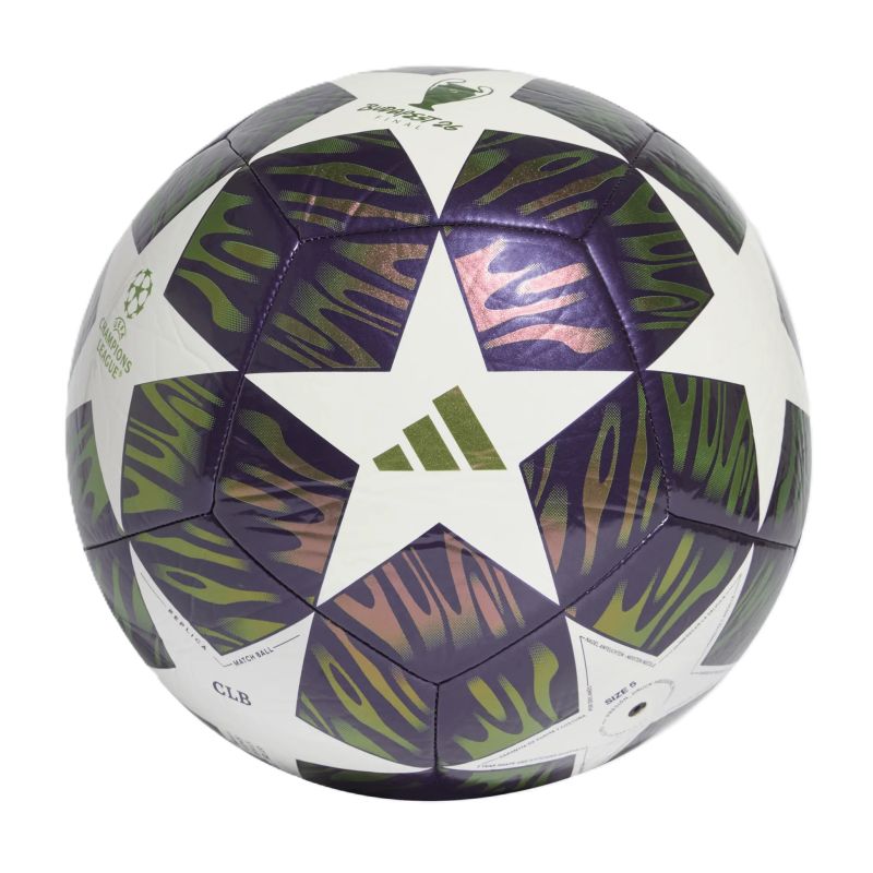 The adidas UCL 25/26 Final Club Purple, Green, and White KT0658 Football is perfect for recreational play on natural grass surfaces. The ball's design is inspired by the official match ball. Standard size. Specifications: 100% recycled thermoplastic polyurethane Machine-stitched casing Butyl bladder Printed UEFA Champions League logo Requires inflation