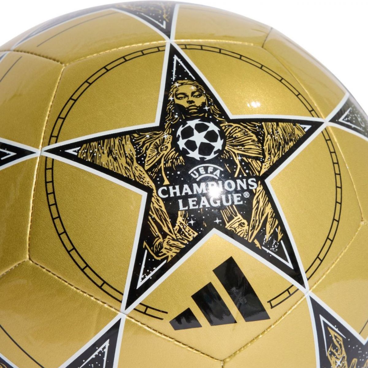 adidas UCL Club 25/26 League Stage Gold JP1536 Football. The ball's design is inspired by the official match ball. Standard size. Specifications: 100% recycled thermoplastic polyurethane · Machine-stitched casing · Butyl bladder · Printed UEFA Champions League logo · Requires inflation