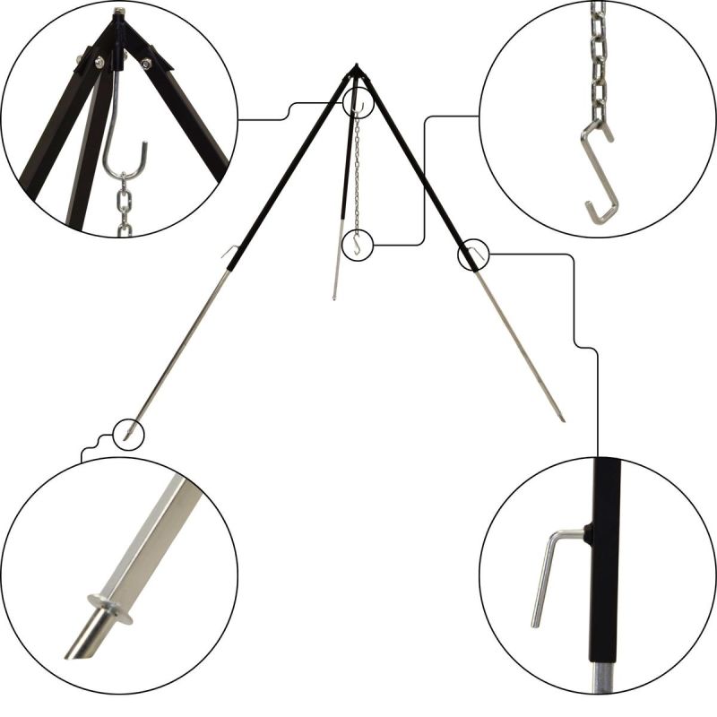 ADJUSTABLE ARMS - Adjustable arms up to 150 cm long allow you to hang the cauldron or grate at the appropriate height above the fire. This allows you to easily adjust the distance from the flames to suit the type of food and the intensity of the fire.
