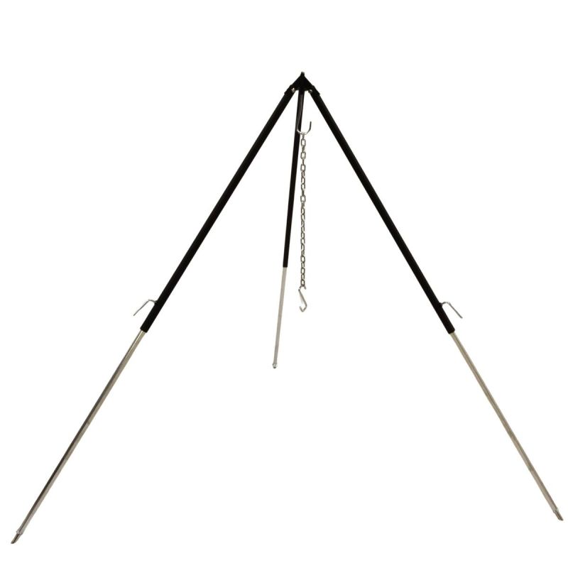 GROUND-DRIVEN ARMS - Driven arms ensure the tripod is stable and securely placed in the ground, even on uneven terrain. This prevents the stand from shifting while cooking over the fire.