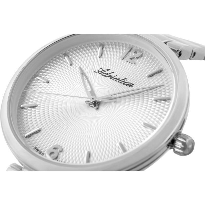 A close-up of this watch's dial is a true feast for the eyes. The mesmerizing guilloché pattern in the center forms geometric rays that catch the light with every wrist movement, creating a rippling effect. The silver hands are designed with a feminine lightness, gliding smoothly across the dial with watchmaker's precision. The hour markers take the form of minimalist, raised markers, perfectly integrated into the dial structure. The design is complemented by the Adriatica name on the dial and a discreet logo on the bracelet clasp and crown.