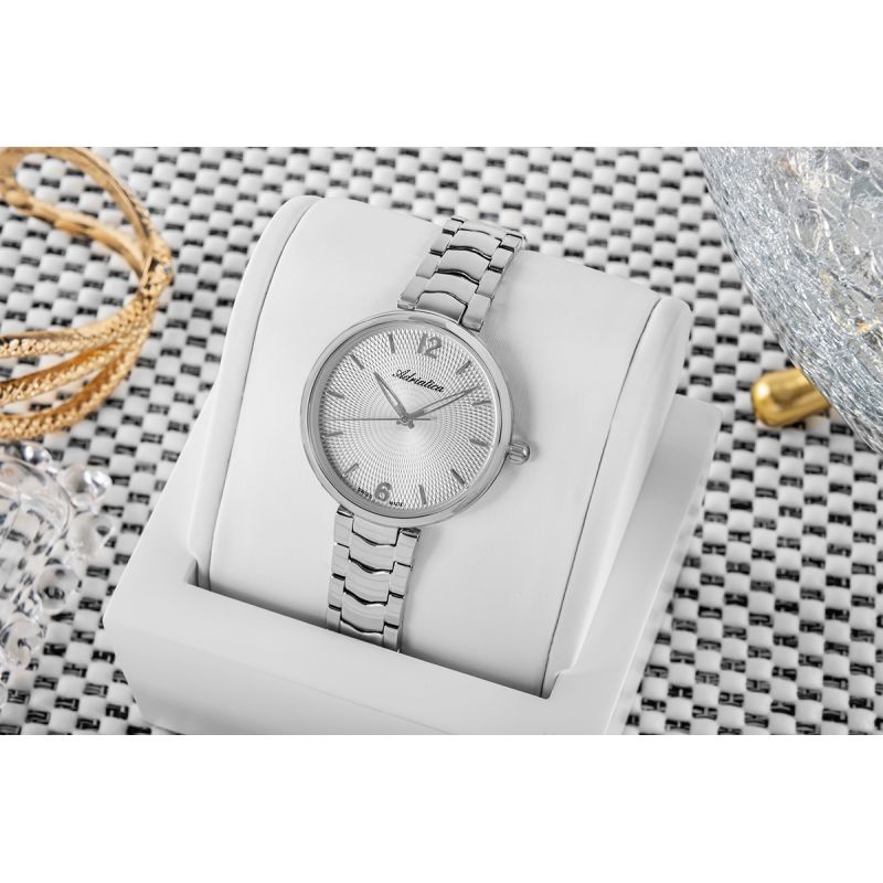 The ADRIATICA Classic A3790.5153Q is the essence of feminine minimalism, dressed in luxurious shimmer. The silver-toned design subtly enhances any outfit – from a white shirt to an evening dress. The dial, adorned with an intricate, radiant pattern, delicately reflects light, creating a soft shimmering effect – like a sheet of gold. Slim hands, elegant indices, and delicately marked numerals 6 and 12 – every detail is designed for the woman who loves class but doesn't require opulence. The bracelet sits on the wrist like a gold chain – comfortably, lightly, and with natural grace. At the heart of this model is a Swiss quartz movement , guaranteeing the reliability and precision of Swiss Made – values that have been synonymous with the highest quality for decades.