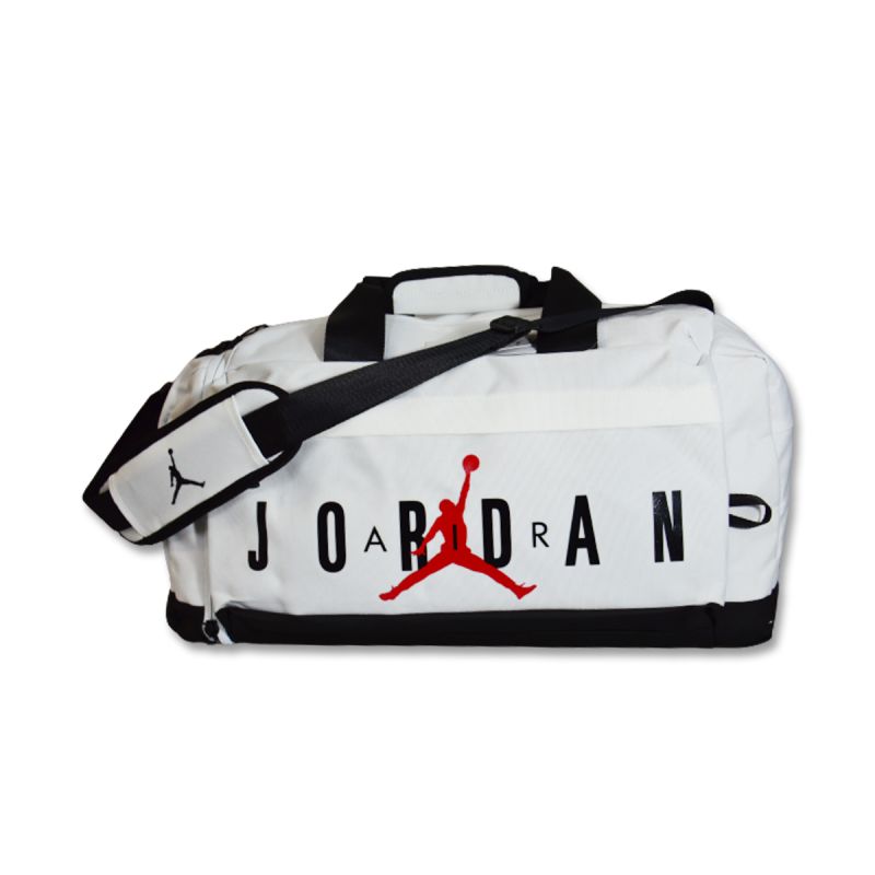 A bag in a universal white color with a red Jumpman logo and a large, black Air Jordan inscription on the front.