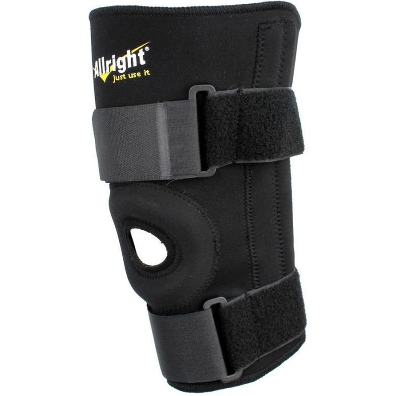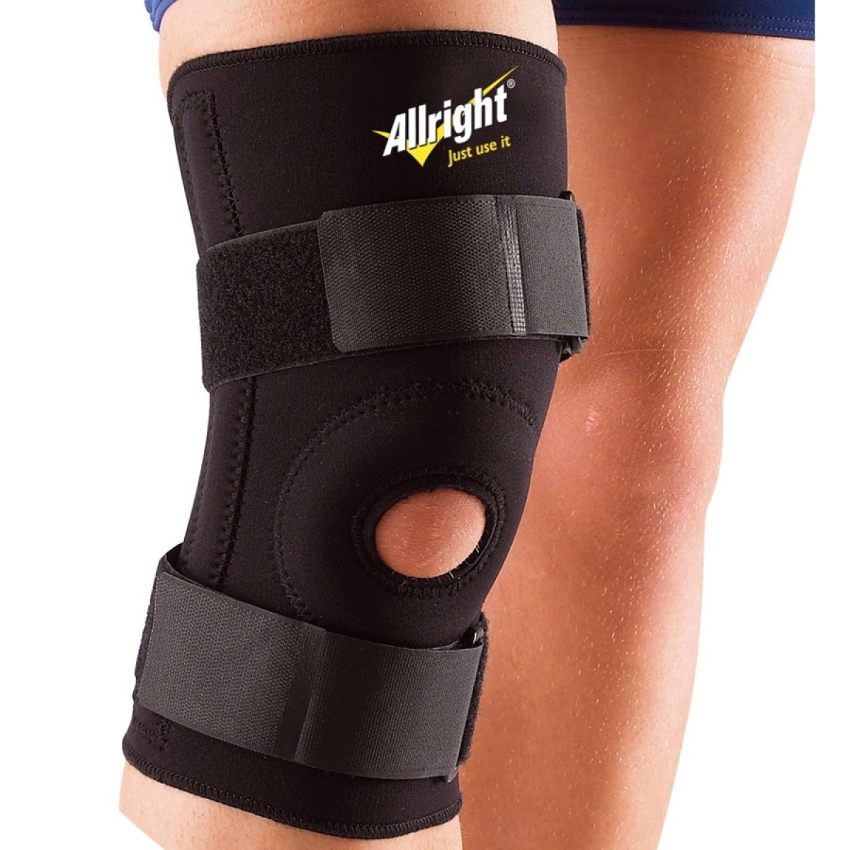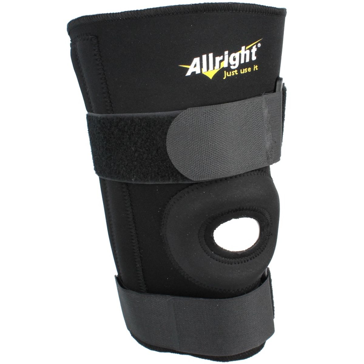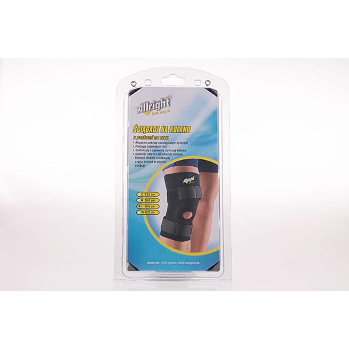 Allright Knee Support - Size M. Made of neoprene, the support features two elastic Velcro straps for a perfect fit. The oval foam around the knee provides comfort and prevents chafing. It doesn't restrict movement, maintaining the knee's full range of motion. Using the latest technology, the support maintains optimal body temperature, warming the joints, muscles, and ligaments. The precise fit of the support reduces pressure on the knee joint and pain associated with swelling. This support is ideal for treating injuries, swelling, and sprains. It is also effective in treating post-traumatic pain syndromes or rheumatic disorders.