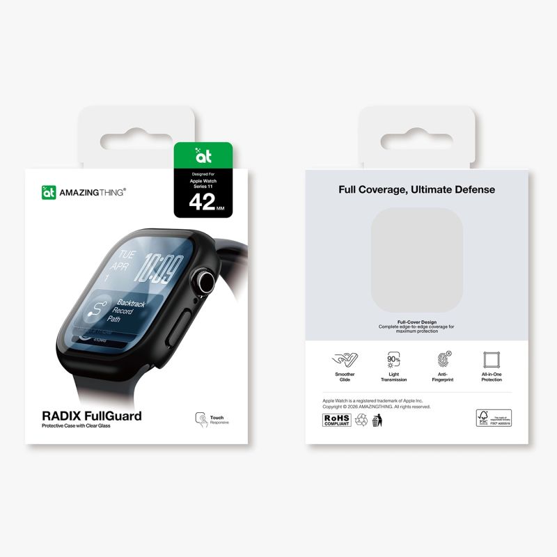 The AmazingThing Radix Glass Screen Protector with FullGuard Case offers complete protection for the 42mm Apple Watch Series 11. The combination of 9H tempered glass and a protective frame shields the screen and case from scratches, impacts, and everyday damage. The ultra-thin design maintains full touch sensitivity, while an oleophobic coating minimizes smudges. The case remains compatible with wireless charging and does not block the buttons or crown.