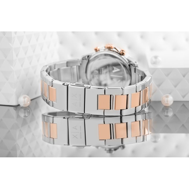 Discover how a segmented two-tone watch strap can add charm to your everyday looks! Its subtle design exudes elegance, introducing a touch of finesse that attracts attention. Crafted from high-quality stainless steel, it not only impresses with its appearance but also ensures durability and comfort. The sensual nature of this strap allows it to fit perfectly on a woman's wrist, delicately enveloping it and emphasizing its femininity. The subtle AX Armani Exchange logo on the clasp adds an exclusive touch.